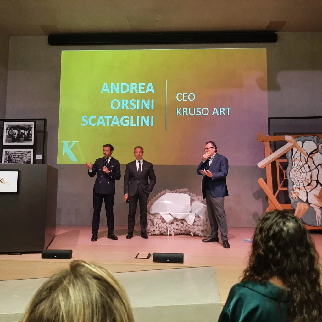 Andrea Orsini Scataglini CEO Kruso Art e Gianluca Garbi Presidente Kruso Art presentati da Luciano Ferraro Vice Direttore del Corriere della Sera all’inaugurazione della nuova sede di Via De Amicis a Milano.