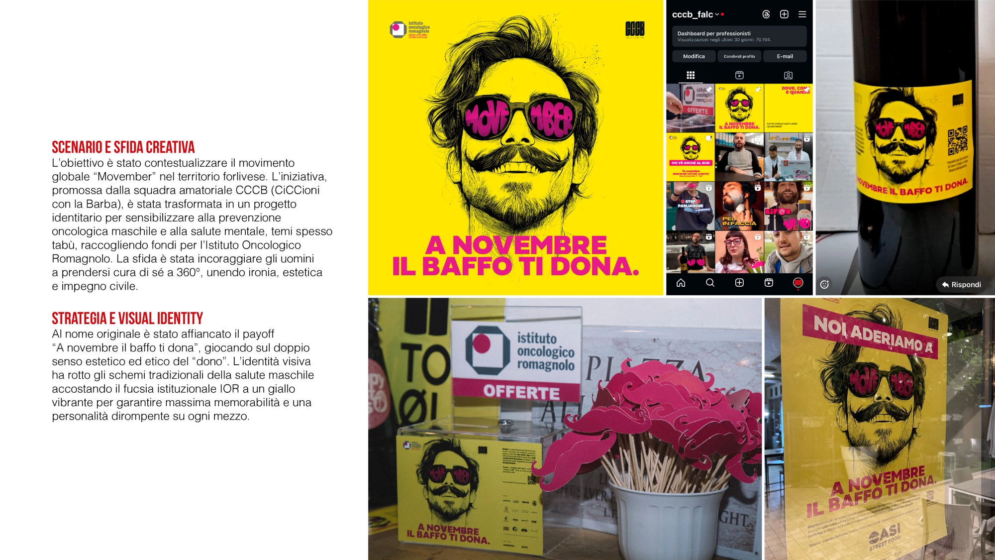 Al nome originale è stato affiancato il payoff A novembre il baffo ti dona, giocando sul doppio senso estetico ed etico del dono. L’identità visiva ha rotto gli schemi tradizionali della salute maschile accostando il fucsia istituzionale IOR a un giallo vibrante per garantire massima memorabilità e una personalità dirompente su ogni mezzo.