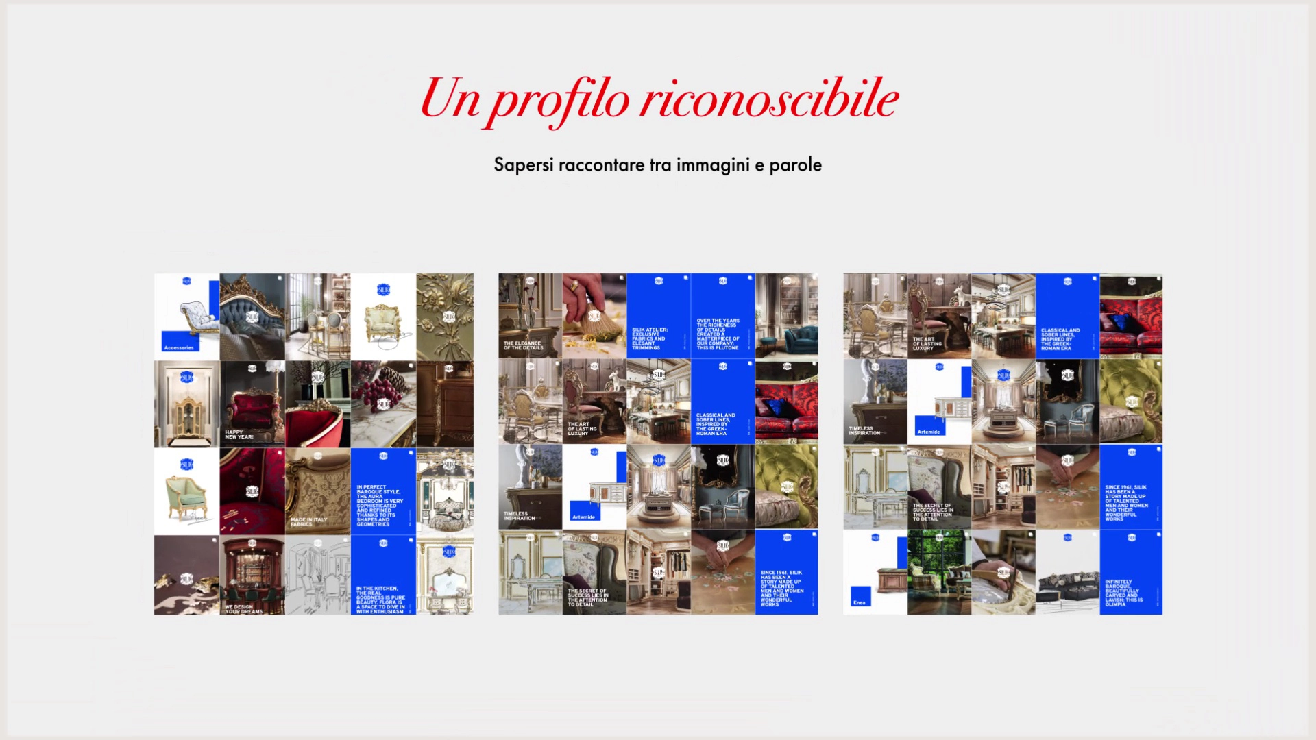 L’obiettivo è stato quello di ripensare completamente la presenza digitale del brand, attraverso un lavoro di restyling rispetto ai post precedenti, che risultavano privi di una visione coerente e poco curati dal punto di vista visivo e narrativo. La nuova strategia mira a costruire una vetrina digitale dal respiro internazionale, capace di valorizzare in modo più efficace l’identità del marchio e l’eccellenza dell’arredo di lusso Made in Italy. Attraverso immagini attentamente selezionate di lavorazioni, prodotti e ambientazioni, la comunicazione oggi mette in primo piano qualità, stile e artigianalità, rafforzando il posizionamento globale di Silik. La scelta di utilizzare copy in lingua inglese risponde alla volontà di dialogare con un pubblico internazionale, in linea con la presenza del marchio sui mercati esteri. Il risultato è una narrazione visiva coerente, riconoscibile e curata, capace di parlare in modo autorevole a professionisti e appassionati di design in tutto il mondo.